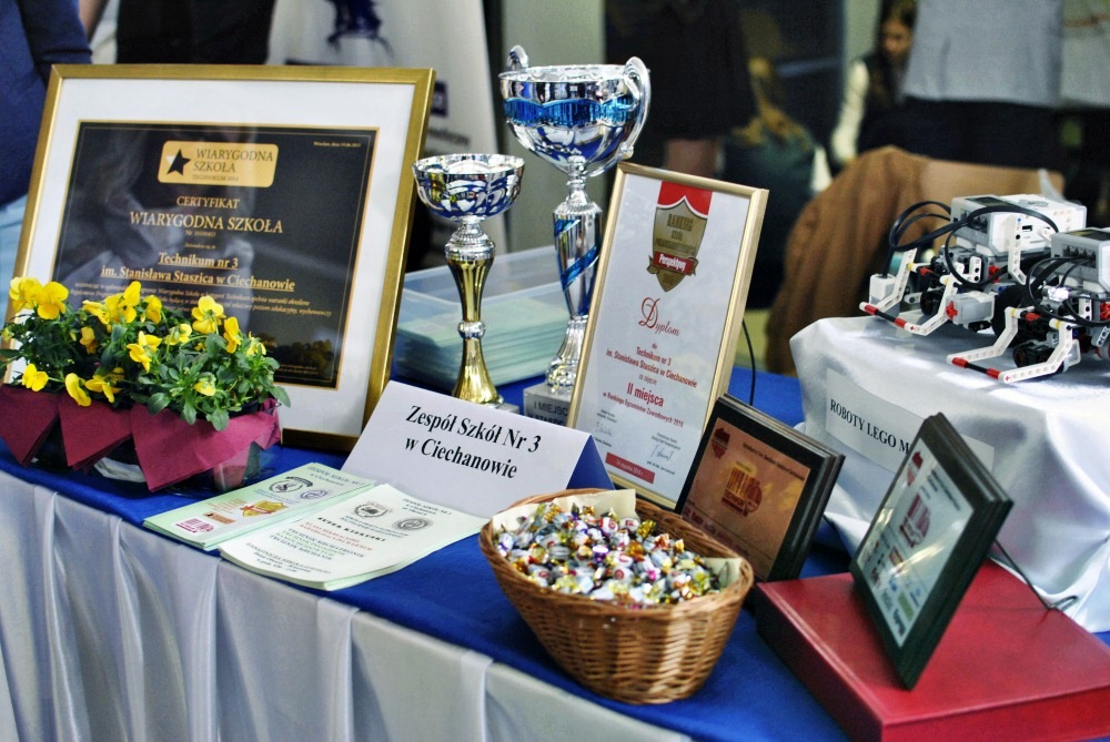 Na Targach zaprezentowała się również nasza szkoła, przedstawiając ofertę kształcenia dla absolwentów gimnazjów. Nasze stoisko cieszyło się ogromnym zainteresowaniem. Przed halą sportową uczestnicy targów mogli podziwiać pokaz motocykli, gokartów i aut zorganizowany przez uczniów naszego Technikum. Nasz szkolny zespół NaPięcie umilał czas zwiedzającym stoiska grając różne utwory muzyczne.